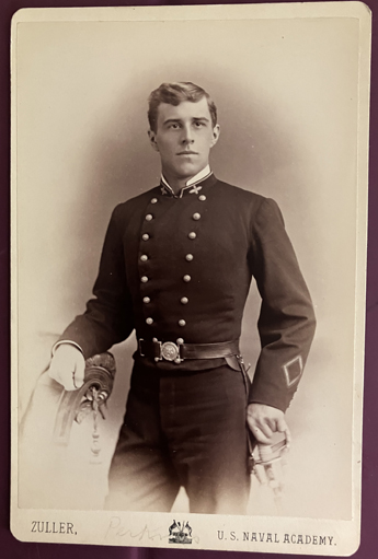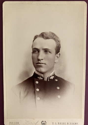 He wears double breasted shell jacket with Engineers oak leaves on collar. Taken by J.M. Fuller U.S. Naval Academy. Marked in pencil "Day"?. | SALE $12.00 | |
