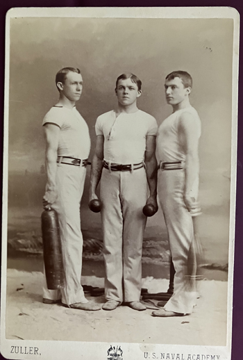 Shows three men dressed in athletic attire, holding gym equioment. One holds an Indian Club ( image blurred due to long exposure setting), one with a set of dumbbells and a third with a cylinderical weight. Gymnastics and physical training were deisgned for improving the physical fitness, discipline and agility of sailers and marines. Taken by F.M. Zuller, U.S. Naval Academy. | SALE $20.00 | |