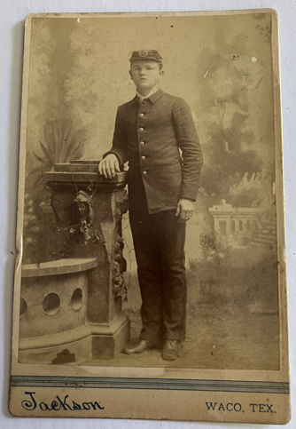 Circa 1880'2, he wears the typical dark wool six button jacket. He wears a kepi with gold bullion wreath encircling "BC". Taken by "W.D. Jackson, Photographic Studio, Waco, Texas...." | SALE $38.00 | |