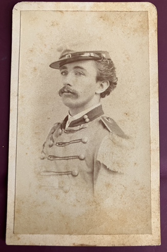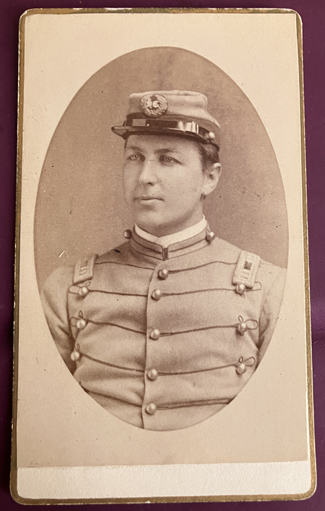 Shows him in his uniform with kepi with wreath insignia on it. Cannot make out 1st letter but second is "C". He as shoulder straps with two bars and central item that I cannot discern. Back has "Adams, 311 Main Street, Worcester, Mass. First Floor." | SALE $50.00 | |