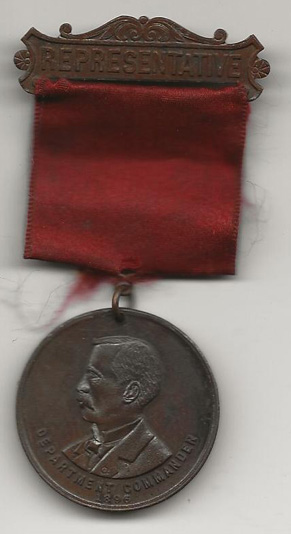 Front of medal has bust image of individual with "Department Commander 1896" and on the reverse "31st Annual encampment Dept. of Illinois G.A.R. Galesburg,May 4-6, 1897" Hung from a maroon red silk ribbon with "Representative" pin bar. | SALE $52.00 |