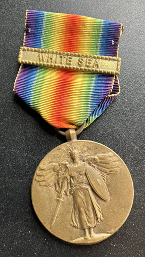 Bronze U.S. Victory medal hung from a ranbow silk ribbon. Has naval operational bar with "White Sea" on it. Issued for service on a vessel which made a Russian port or any combatabt ship in a Russian Port on the White Sea. Dad had a note that only 1000 bars were produced. | SALE $ 180.00 |