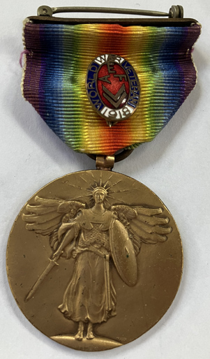 Victory medal with "1918 World War Veteran", 2 chevron AEF (American Expeditionary Forces) lapel pin attached to rainbow ribbon. | SALE $50.00 |