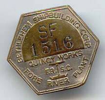 For the "Bethlehem Ship Building Corp Quincy Works Four River Plant." Hexagon nickel plated brass badge with badge # "SF1516" in center. Pin backed. | SALE $ 30.00 |