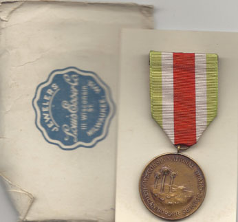 Brass planchard with palm trees and mountains with "Wisconsin National Guard- Mexican Border Service" on front. Has star with laurel wreath on back and "1916-1917". Hung from a green, white and red ribbon (colors of the Mexican flag). On original card, with "Louis Esser Co. Jewelers Milwaukee, Wis." Mark on envelope. | SALE $45.00 |