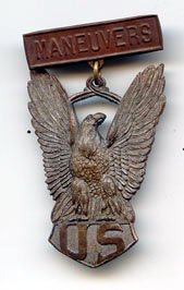 For the 1939 1st Army Maneuvers at Plattsburg Barracks, N.Y. (on the Canadian border.) The first major training of America's newly expanded army in preparation for war with Germany and Japan. Bronze eagle grasping a shield with "US". Has "Maneuvers" pin bar. | SALE $38.00 |
