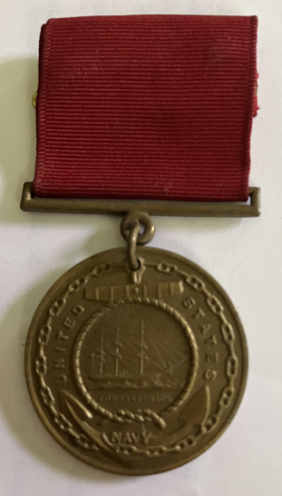 Belonged to William Gansz, a relative of my father JNJ, who served from 1896 to 1920 in the U.S. Navy. Awarded for three years of coninous active sevice without convictions by court-martial or nonjudicial punishment. Has image of the USS Constitution on front with "United States Navy" and reverse has "Fidelity Zeal Obedience". Unnumbered, no inscription. | SALE $25.00 |