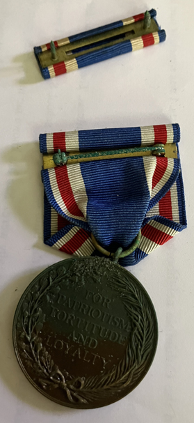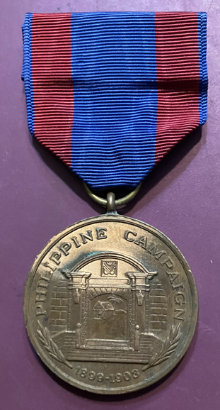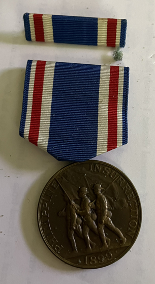Belonged to William Gansz, a relative of my father JNJ, who served from 1896 to 1920 in the U.S. Navy. Awarded for service during the Philippine-American War. Drop has two soldiers and a color bearer holding the U.S. flag. with "Philippine Insurrection 1899" on it. Reverse has"For Patriotism Fotitude and Loyalty". Has No. 10609 Stamped on rim. Includes additional ribbon medal. | SALE $85.00 |