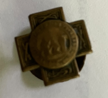 Belonged to William Gansz, a relative of my father JNJ, who served from 1896 to 1920 in the U.S. Navy. Has "Spanish War Veteran" on it and is a miniature of the larger cross shaped medal. Arms have crossed swords, rifles,cannons and anchor. Made to be worn in a buttonhole. Shows wear. | SALE $15.00 |