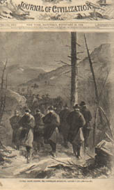 Vol. VIII.- No. 373. New York ,Saturday, February 20, 1864. Title under engraving on front "General Grant Crossing the Cumberland Mountains, January 7, 1864. Other engravings "Military Hall of the Third Corps, Army of the Potomac", Center spread is "St. Valentines Day 1864" with naval and army cherubs delivering valentines letters from the troops. Also "Scenes in and Around Richland Jail, Columbia, South Carolina" "Fort Fisher, Commanding the New Inlet Entrance to Cape Fear River. The British Steamer 'Hansa' Running the Blockade Under the Guns of the Fort." "The Destruction by Fire of Colt's Armory, at Hartford, Connecticut" Pgs. 113-128. Pg 17/18 has been cut and only has engraving and info on "Railroad Accident in Kentucky". | SALE $8.00 |