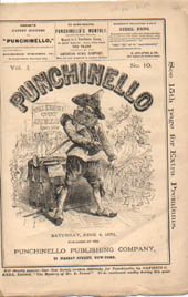 Punchinello Vol. 1, No. 10, New York Saturday, June 4, 1870. Has engraving on pg. 153 titled "The New Plea for Murder" With police officer in front of police station with man who has shot another man and holding a certificate of marriage. Subtitled "Man With Revolver. 'Of Course I've Killed Him, But it's no murder, for I'm insane. If you don't believe it, there's my marriage certificate!" | SALE $ 7.00 |