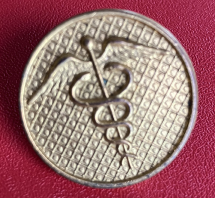 Circa 1920's, gilt with caduceus. Horizontal diamond background. 1" diameter, screwpost (no nut), two needlespoints. | SALE $15.00 | |