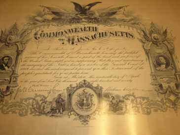 For "Andrew A. Jacobs Co. C 5th Infantry" honoring the faithful services of her sons who formed a part of the land and sea forces of the U.S. employed in suppressing Rebellion. (Massachusetts Volunteer Militia) Dated April 19th, 1870, Boston and signed by William Claflin, the Governor. Approx. 16 3/4" x 21". | SALE $25.00 |