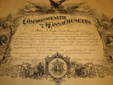 For "Arthur F. Poole, First Heavy Artillery" honoring the faithful services of her sons who formed a part of the land and sea forces of the U.S. employed in suppressing Rebellion. (Massachusetts Volunteer Militia) Dated April 19th, 1870, Boston and signed by William Claflin, the Governor. Approx. 16 3/4" x 21". | SALE $25.00 |