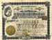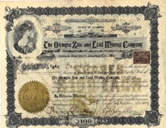 100 shares in the Olympia Company of Jasper Co., Missouri, dated 1899. Printed in green and god, it has a 25¢ battleship documentary stamp attached with "Sep 25/99 ..." 8¼"x 10½" overall. |
