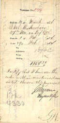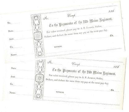 Blank form "No._ Camp_186_To the Paymaster of the 23d Main Regiment. For value received, please pay to A.F. Jackson, Sutler, _ dollars, and deduct the same from my pay at the next pay day. _C._ Witness". Unissued with full stub. Approximately 3-3/8" x 8-3/8" overall. | SALE $20.00 each |