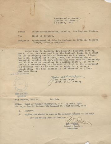 "Maj. John R. Sanborn, 1st Separate Squandron Cavalry Mass. N.G, has resigned from the National Guard because of oincreasing demands of business on his time... I recommend he be invited to apply for a reseve commission." Signed by John Alden Degen, Lieut. Col., Cavalry and Geo. Vermeer, Colonel, Cavalry, Executive. Dated March 16, 1921. Has stamp of Chief of Cavalry as well. |