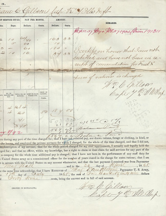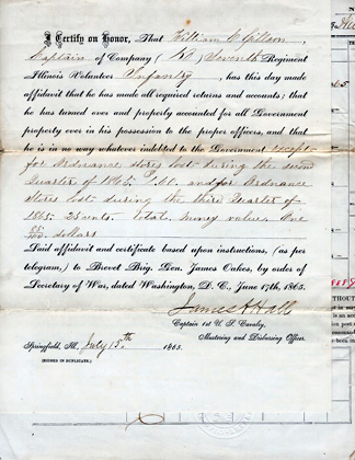 For William Gillson, Capt. 4th Ill. Inf. for pay due. Certification states that he turned over all government propoerty except for ordnance store lost during the second quarter of 1865 and this quarter. Signed by James Hall, Capt. 1st U.s. Cavalry, Mustering and Disbursing Officer. Dated July 1th, 1865 Springfield, Ill. Signed by William Gillson as well. | SALE $30.00 |