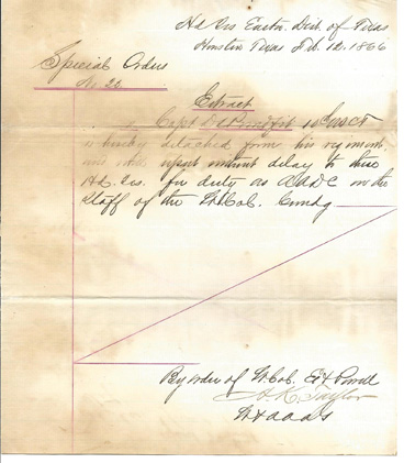 1866 U.S. Army Headquarters Eastern District of Texas Special Order No. 26 written in Houston, Texas in Feb. 1866. Ordering Capt. D.L. Proudfit, 10th U.S. Colored Troops, to staff duty at Headquarters. Signed "By Order of Lt. Col. E Powell, H.K. Taylor?". Entirely handwritten in ink. Approximately 7-3/4" x 9-1/2" overall. | SALE $28.00 |
