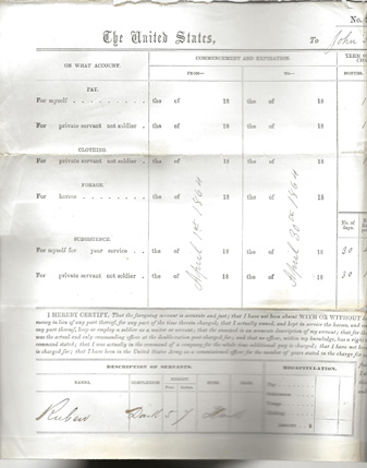 1864 Pay Voucher for 2nd Lieut. 1st REgt. U.S. Inf. John H. Purcell. "I hereby certify, on honor, that I am on duty at Madiosn Wisconsin by authority of Special Order No. 499 dated Washington Nov. 10th/63 War Dept. Adjt. Gen. Office. For the month of April of 1864. Lists one servant. | SALE $40.00 |