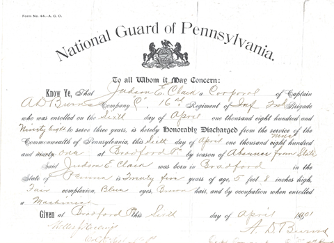 For "Judson E. Clark, a Corporal of Captain AD Burns Compnay C 16th Regiment of Inf. 2nd Brigade" "enrolled ...one thousand eight hundred and ninety eight to serve three years...is herebt honorable discharged from the service of the Commonwealth of Pennsylvania..." signed by Burns and a Col. of the Co. "C" 16 Regt. N.G.P. | SALE $ 18.00 | |