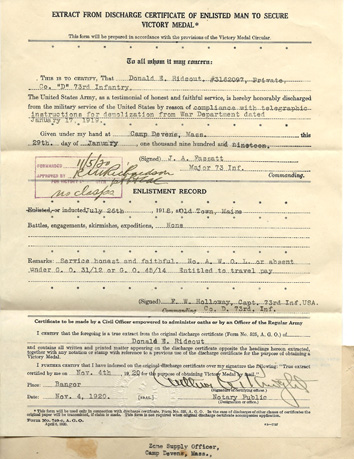 Envelope marked "Zone Supply Officer, Camp Devens, Mass." For Donald E. Rideout, Private, Co. "D" 73rd Infantry. Stamped Forwarded 11/5/20 and Approved by R.U. Richardon 1st Lieut. Col. "no clasps" Notarized in 1920. | SALE $15.00 |