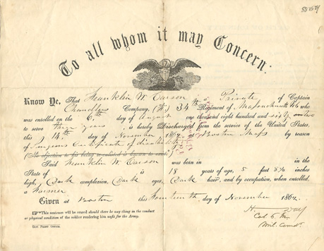 "Know ye that Franklin W. Carson, a Private of Captain Chandlers Company "F" 34th Regiment of Massachusetts Vols....enrolled....1862 to serve three years....is hereby discharged..1862 at Boston .... by reason of Surgeons Certificate of Disability....". Has description of Carson, signed by "H. Day Col. 5th M. Mil. Comdr." | SALE $38.00 |