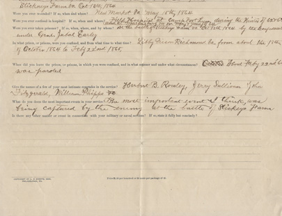 Form and envelope for Thomas Ault Taylor. Born in Charlemont, MAss, he enetered in service in Worcester, MA on July 14th, 1862. He was a Private in Co. F 34 Regt. Mass Vol. Infantry. His first battle engaged was Harpers Ferry, CA July 1863. He was wounded at New Market, Va in 1864 and was confined to Field Hospital at Camp Fort Lyon during the winter of 62 & 63. He was taken prison at the Battle of Stikey Fram Va in 1864, by the COnfederates under Genl. Jubal early. He was paroled.Envelope for form has an 1891 postmark. Addressed to J.A. Halligan, Shelburne Falls, Mass. | SALE $ 15.00 |