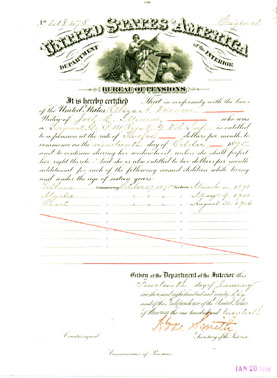 For "Eliza A, Monroe, widow of Joel D. Monroe who was a Sergeant Co. C 111 Reg. N.Y. Vol. Inf." $12/month commence on October 19, 1895 and to continue during her widowhood...And also entitled to $2 per month additional for each of the following named children while living and under the age of sixteen years. "Lillian, Myrtie, Pearl". Signed Jan. 14, 1896 by H. Smith, Secty of Interior. Countersigned by Lochorn, Commissioner of Pensions. 4page sheet (nothing on inside pages), folds into a tri-fold. No. 418.475 Original. Stamped Jan 20 1896. | SALE $21.00 |