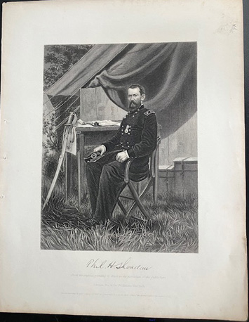 Shows him at his field desk with hm holding hat in lap and sword and belt against the desk. Labeled "Phil. H. Sheridan form the original painting by Nast in the possession of the publishers, Johnson, Fry & Co. Publishers New York". Has 1865 copyright date. One image has three small punctures onleft side in white margin. The other has a missing lower left hand corner of margin that does not affect image or printing. the second is also more browned in color. | SALE $15.00 | |
