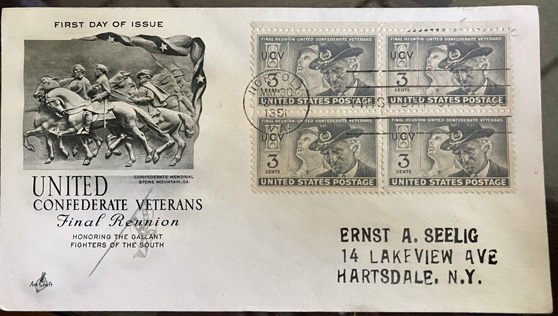 "United Confederate Veterans Final Reunion Honoring the Gallant Fighters of the South." Postmarked May 30, 1951, Norfolk, VA. Has plateblock of 3 cent stamps. | Have several SALE $5.00 each |