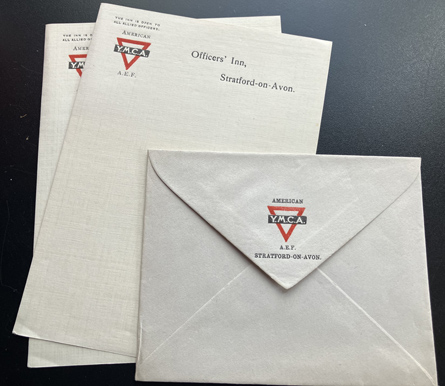 Marked "Officers' Inn, Stratford-on-Avon, The Inn is Open to all Allied Officers, American A.E.F. Y.M.C.A." Approximately 4-1/4 x6" overall for paper size. There are two sheets of stationary and one envelope. | SALE $10.00 | |