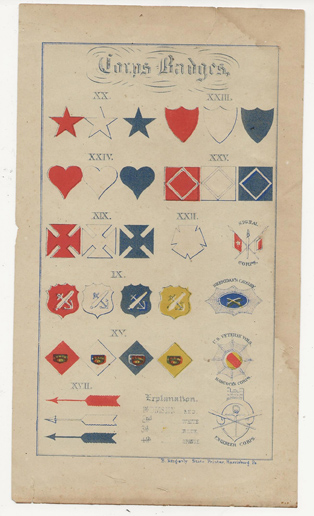 Two pages of Corps Badges, color lithograph red, white, blue and "orange" (gold) by B, Singerly, State Printer, Harrisburg, Pa. (1869-1871) Pages torn from book. | SALE $45.00 for both |