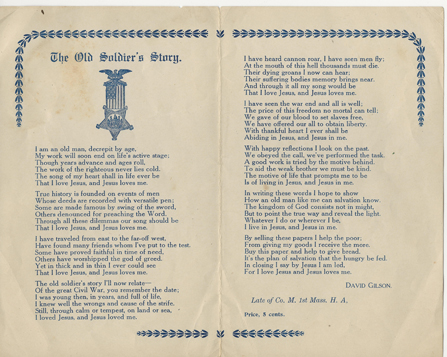 The Old Soldier's Story | Leaflet folded in half of a poem by David Gilson, Late of Co. M 1st Mass. H.A. the last paragraph of poem (about time in war) says he is selling these papers to help the poor. | SALE $5.00 | |