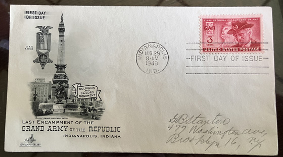 Titled " Last Encampment of the Grand Army of the Republic, Indianapolis,Indiana". Postmarked Aug 29, 1949 Indianapolis, Ind. Single Stamp. | SALE $5.00 | |