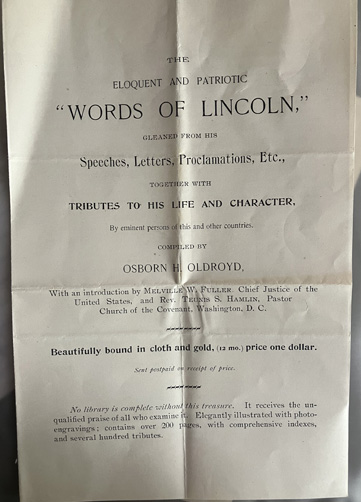 "The Eloquent and Patriotic 'Words of Lincoln,' Gleaned from His Speeches, Letters, Proclamations, Etc., Together With Tributes to His Life and Character, By eminent persons of this and other countries, Compiled by Osborn H. Oldroyd,...." 4 page advertising pamphlet for book, with words from Oldroyd as to why, as well as notes from individuals commending him for his undertaking. | SALE $ 10.00 | |