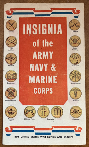 Tri-fold pamphlet with image of the different branches of insignia. With ad for American Express Travelers Cheques on the back. World War II era. | SALE $7.00 | |
