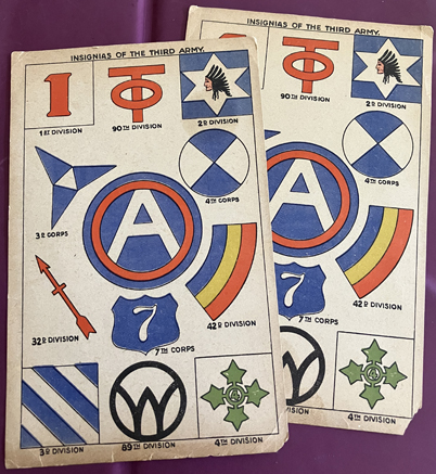 Shows shoulder sleeve insignia of the various units of the United States Third Army. Divided back, unused. One has small corner (bottom right) missing- see image. | SALE $7.00 each |