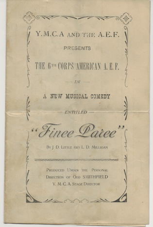 "Y.M.C.A. and the A.E.F. Present The 6th Corps American A.E.F. in a New Musical Comedy Entitled 'Finee Paree' by J.D. Little and L.D. Milligan- Produced Under the Personal Direction of Geo. Smithfield Y.M.C.A. Stage Director". Lists the players and the acts of the shows. 4 pages overall, approximatelt 6 x 9-1/2" overall. | SALE $8.00 |