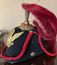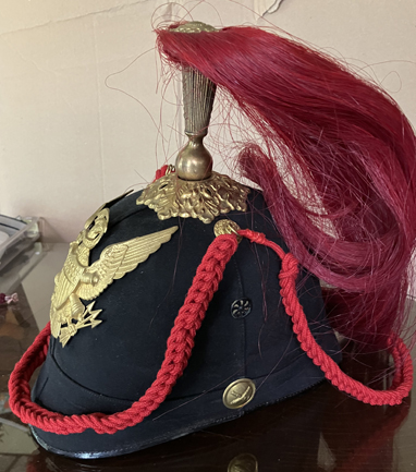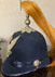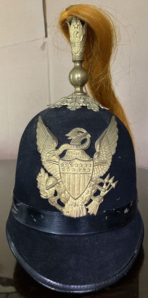 Original. Dark blue wool covered cork with gilt plume holder with red horse hair plume. Crossed cannon side buttons and large brass eagle artillery plate (With crossed cannons behind the shield). Has triple braided helmet cord (not secured). Has sweatband and tag with "12" on it. Worn 1882 thru 1902. | SALE $600.00 |
