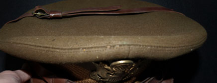 For the white summer uniform. With gold bullion oak leaves (so called "scrambled eggs") on top of blue cloth covered visor. Has gilt chin strap, with U.S. Army Officer's buttons. Also a gilt U.S. Army Officers eagle hat insignia. Made by "Kassan-Stein Inc. 510 Eleventh St. N.W. Washington, D.C. on inside. Size 7 1/8 on leather sweat band. | S $65.00 |