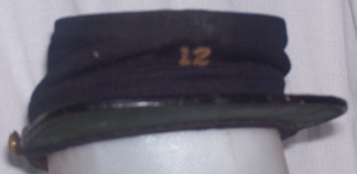 Dark blue wool kepie with high 2 1/2" crown, flat bound leather vizor (green enameled underside), leather chin strap, leather sweat band, NY side buttons. Gold bullion embroidered "12" on front. Black polished cloth lining. Size 6 7/8. Mothing- requests pictures. | S$400.00 |