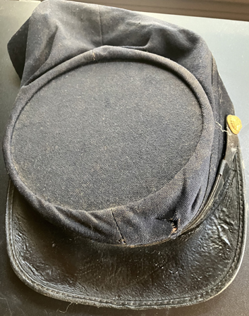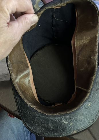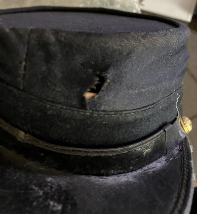 Kepi is in rough shape. Large hole in front (see images), missing lining. Offered at significant discount because of issues but can be repaired with someone familiar with restoration work. Sweatband intact, eagle buttons, chin strap also present. If you would like better photos, please email me. |