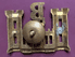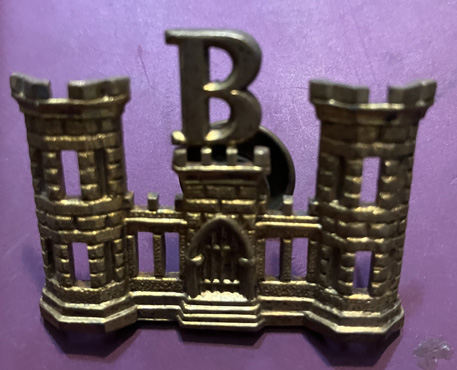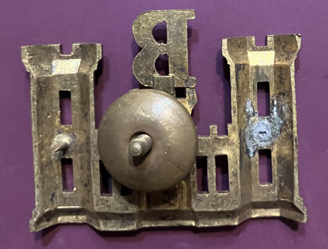 Brass, turreted castle with cut out windows. Has "B" affixed above. Screw Post and nut on back. Approximately 1-7/10" x 1-3/10" overall. Had two needle points, only one remains. | SALE $100.00 |