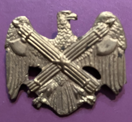 Right facing eagle with reversed wings, and two crossed fasces superimposed. Pin backed. Approximately 1-1/10" x 1" overall. | SALE $15.00 |