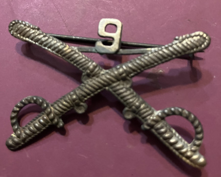 False embroidered crocastle insignia ssed sabers with "9" above the angle. Pin backed with "C" clasp. Approximately 1-9/10" x 1-3/10" overall. | SALE $85.00 SOLD |