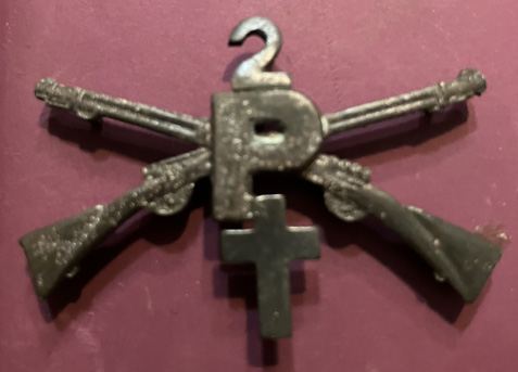Bronze finish Approximately 2" wide x 1-3/10" high crossed rifles with "P" superimposed. Has "2" above and cross below and four sew on loops on back. See LaFrambosie I for similar. | SALE $75.00 |