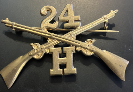 Gilt crossed rifles with "24" above and "H" below. Pin backed, "C" clasp. Approximately 2-3/10" x 1-1/2" overall. | SALE $25.00 | |
