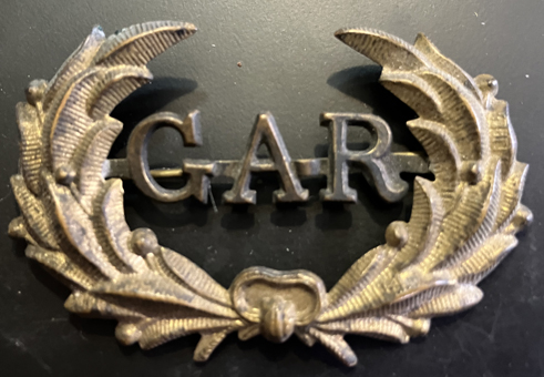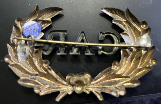Gilt wreath with letters "GAR" in center on cross pice. Pin backed with "C" closure. Approximately 2-1/2" x1-3/4" overall. This one has been "smooshed" a bit. Have an additional one that has separation between the letters A & R. | SALE $90.00 | |