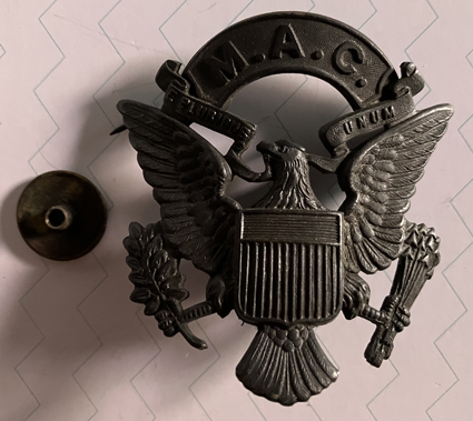 Black bronze eagle with shield and banner with "M.A.C." (Mount Aloysius College?) on it. Approximately 2" x 2" overall, with screw post back. | SALE $20.00 | |